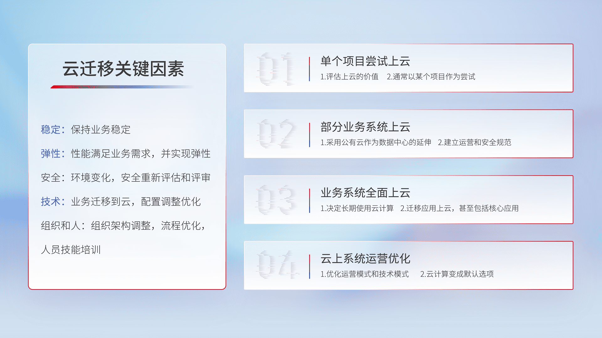结合实际业务,,,从规划设计、、、云平台选型、、云原生改造、、、、数据迁移、、集成交付,,,迁移全过程为客户识别最佳上云路径,,,,做好风险识别管理,,,,设计网络架构、、、、身份权限、、、安全审计合规、、、操作审计、、、、日志审计、、、、监控告警策略、、多站点容灾设计等,,对云上基础设施进行整体规划,,,,提升IT治理水平,,,,以满足弹性、、、高可用、、、高性能的需求。。。