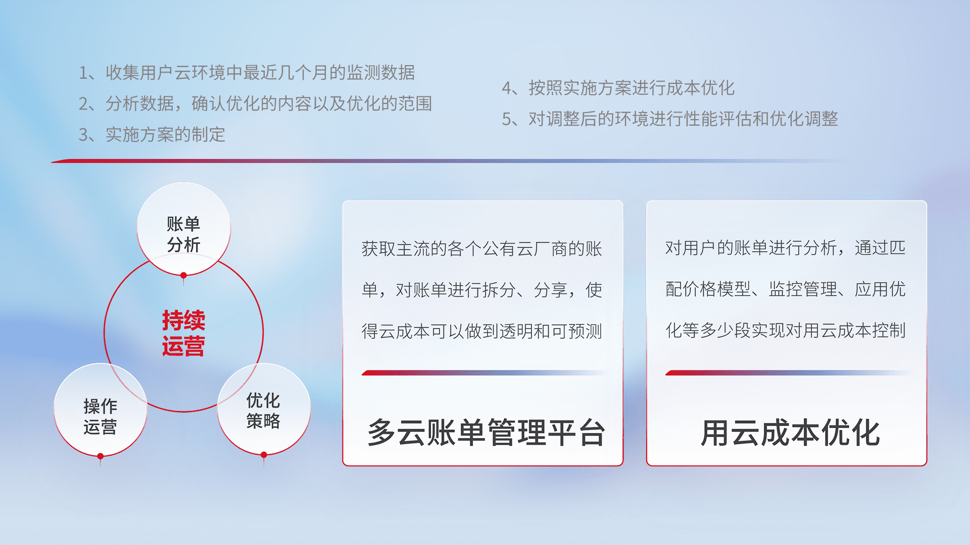 通过多云纳管,,以统一的资源数据模型把客户的云资源进行抽象和封装,,,,进而实现对多云资源的统一操作,,,保障云资源管理的可靠性、、、稳定性与可用性。。。。量身定制化运维内容,,,,配置、、开发运维、、补丁管理、、、备份、、、监控、、、、认证和访问管理、、审计和日常巡检等,,,,保障在用云过程中的可靠度,,稳定度以及高可用率。。。。